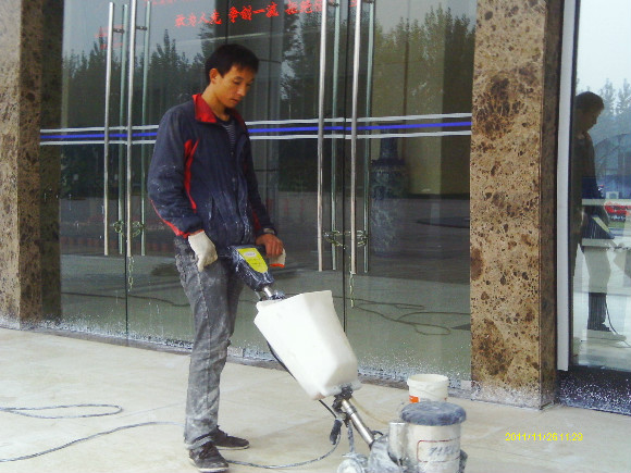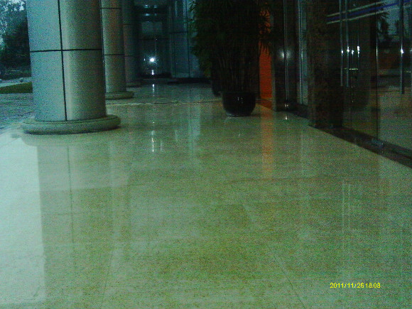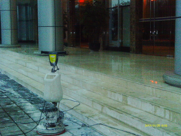 到了70年代末,一種可塑性水溶性結晶聚合物的誕生,亦即是現今常說的水蠟,進化了石材護理的歷史,可以利用這種物質對不同材質的大理石進行護理。分底蠟(封蠟),面蠟(拋光蠟)及保養蠟(日常修補蠟)是對大理石的塑層進行保護并利用高速拋光來增亮,對石材的保護起到一定的作用。但是這種水蠟不足之處是蠟層的硬度有限,稍欠保養,腳步帶進的塵土將很容易把蠟層及石材磨花。同時,遇上雨水季節,因室外雨水塵埃會有一定的雜質,通過人的腳步帶進后,對蠟層的分子組成將造成一定的影響。直觀看到是蠟層變黃及缺光澤,也就是以后常見到的許多客戶為什么須經常將腐蝕的蠟層用起蠟水脫去,再重新分工序打上底蠟和面蠟,每次的工作量及耗用的物料較大,這種工藝現市場上很普通,我們稱為石材打蠟第二代。